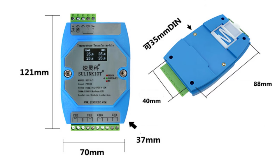 Modulo de extension universal con RS485 y pantalla para sensores PT100 de 3 hilos.